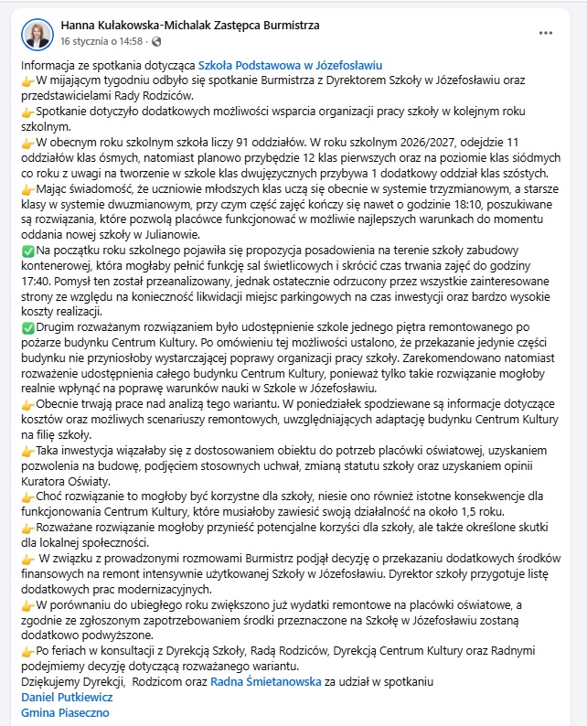 Po serii artykułów w Jó-Ju News opisujących dramatyczną sytuację dzieci w Szkole Podstawowej im. Janusza Korczaka w Józefosławiu opublikowaliśmy również kilka tekstów Feliksa Bentkowskiego, w których zaproponował, jak szybko i tanio można umożliwić dzieciom normalne funkcjonowanie w szkole, a przynajmniej – jak można stworzyć znacznie lepsze warunki edukacji. Sprawą szybko zainteresowali się radni z zastępcą burmistrza Hanną Kułakowską-Michalak na czele. Z ich działań i wypowiedzi wynikało, że być może już wkrótce żadne dzieci nie będą musiały kończyć lekcji o 18:15 i co najmniej ogromna większość dzieci nie będzie kończyć lekcji o 17:25. A przynajmniej – że sytuacja uczniów i ich rodzin poprawi się najpóźniej od rozpoczęcia roku szkolnego 2026/27.