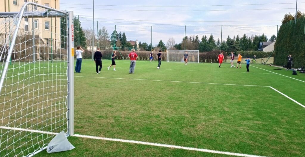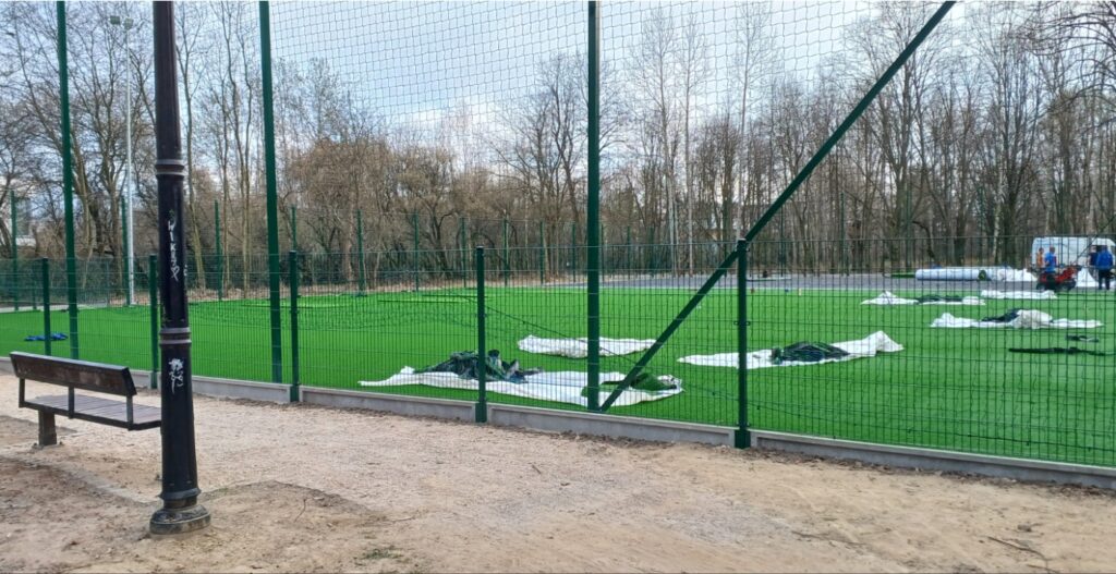 Na boisku są linie, bramki z siatkami i piłkołapy wokół boiska. Linie boczne boiska są tak bardzo oddalone od ogrodzenia, że… na sztucznej trawie poza samym boiskiem jest bardzo dużo miejsca dla rezerwowych, rozgrzewających się, kibiców lub opiekunów. Bardzo dobra wiadomość jest taka, że zamiast czarnego gumowego granulatu, który jest lub może być niekorzystny dla zdrowia grających, na boisku przy Nefrytowej wysypany został typ nowoczesny – bezpieczny dla zdrowia.