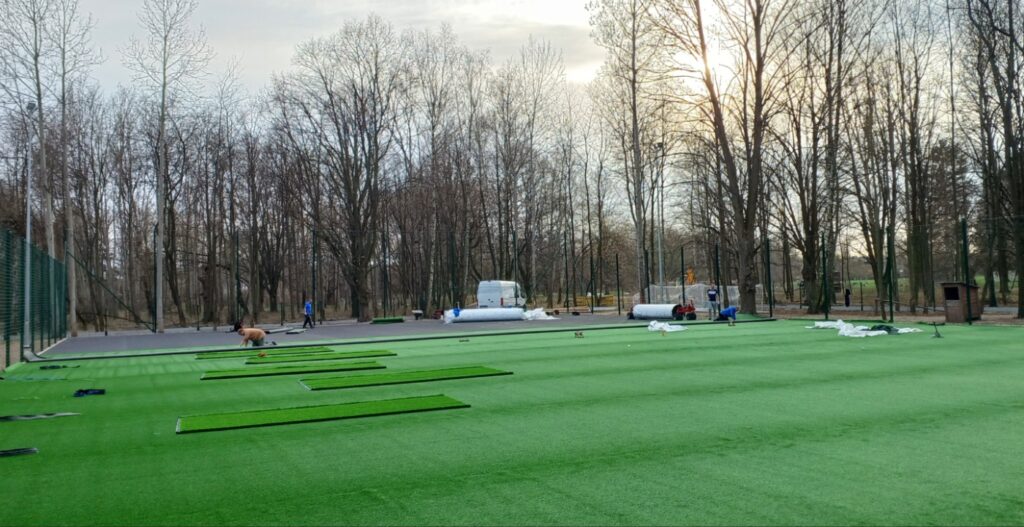 W czwartek trawa była rozwijana, kładziona i przymocowywana. Linii boiska jeszcze nie ma, więc nie widać, jak duży będzie plac gry. Tutaj miejsca dla publiczności na sztucznej trawie nie są potrzebne tak bardzo jak przy Nefrytowej, ponieważ tam nie byłoby innej możliwości obserwacji gry spoza boiska, natomiast w parku przy Ogrodowej chętni będą mogli obserwować grę co najmniej z dwóch stron zza ogrodzenia. Dlatego ważniejsze jest, żeby tutaj linie bramkowe i boczne boiska obejmowały jak największą powierzchnię trawy.
