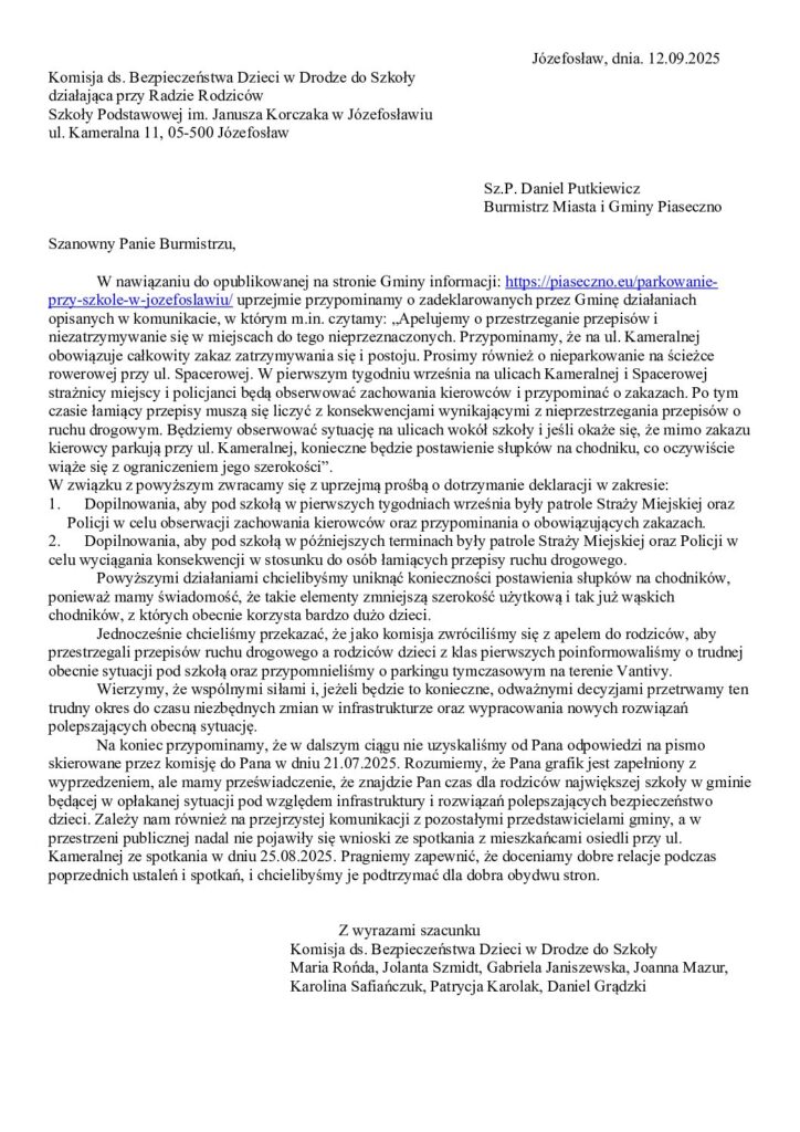 O dopilnowanie, żeby patrole Straży Miejskiej i Policji obserwowały zachowania kierowców przy Szkole Podstawowej im. Janusza Korczaka w Józefosławiu, przypominały im o obowiązujących zakazach i w późniejszych terminach wyciągały konsekwencje w stosunku do łamiących przepisy ruchu drogowego – z taką prośbą do burmistrza Piaseczna Daniela Putkiewicz zwróciła się Komisja ds. Bezpieczeństwa Dzieci w Drodze do Szkoły działająca przy Radzie Rodziców szkoły przy ul. Kameralnej.